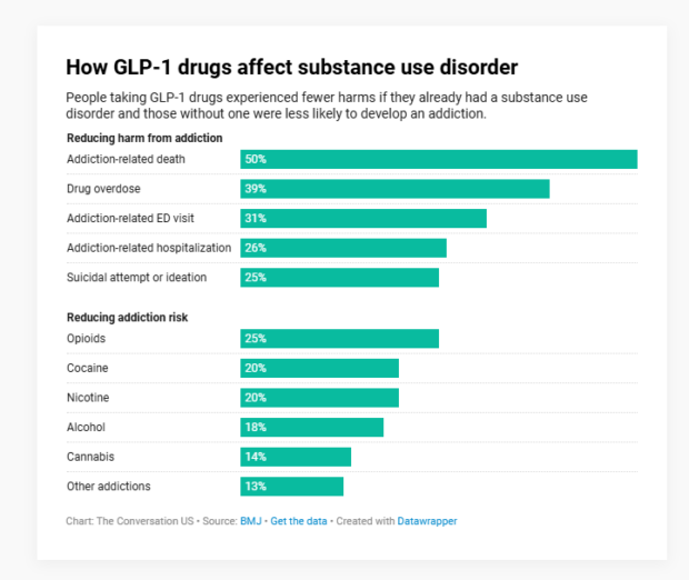 Amongst those struggling with addiction, there were 39% fewer overdoses, 26% fewer drug-related hospitalizations, 25% fewer suicide attempts, and 50% fewer deaths from substance use among those taking GLP-1 drugs.